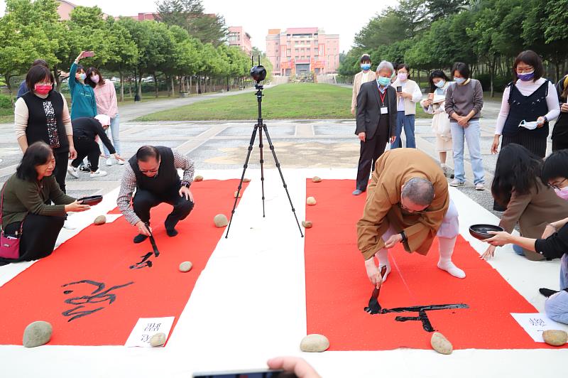 (中央社訊息服務20230106 15:40:38)南華大學視覺藝術與設計學系一年一度「春納-迎春納福」活動,於日前(1月3日)在中道樓一樓中庭舉辦,由藝術與設計學院院長兼視覺藝術與設計學系主任葉宗和教授帶領該系師生,共同揮毫迎接新的一年,也為濕冷陰霾的天氣入注一股暖流。春納活動當天,南華大學副校長釋慧開、林辰璋、昇億水電公司董事長黃彥富、嘉義市攝影協會理事長黃英聰、嘉義市文藝作家協會榮譽理事長林家儀以及台灣禮品店負責人徐皖華等師長及貴賓出席共襄盛舉,一同歡喜迎新年。