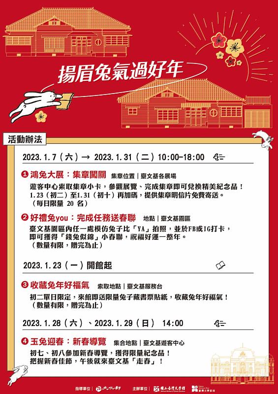 「好禮兔you:完成任務送春聯」,只要在臺文基園區內任一處模仿兔子比「YA」拍照,並於FB或IG打卡,向服務臺人員出示畫面,即可獲得只送不賣的「錢兔似錦」小春聯,好運一整年;1月23日(初二)單日限定,入館即送喜氣的兔子藏書票貼紙,數量有限,送完為止,快來收藏!