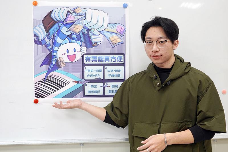 指導老師、多媒體學程助理教授黃懷德指出,林耕杰同學畢業於斗六高中美術班,過去他的創作風格偏向寫實,此次參賽,他嘗試用可愛明朗的畫風,宣導雲端發票的方便性,獲得評審青睞,很開心他能突破自我,也期待他未來有更多元的電腦繪圖創作。