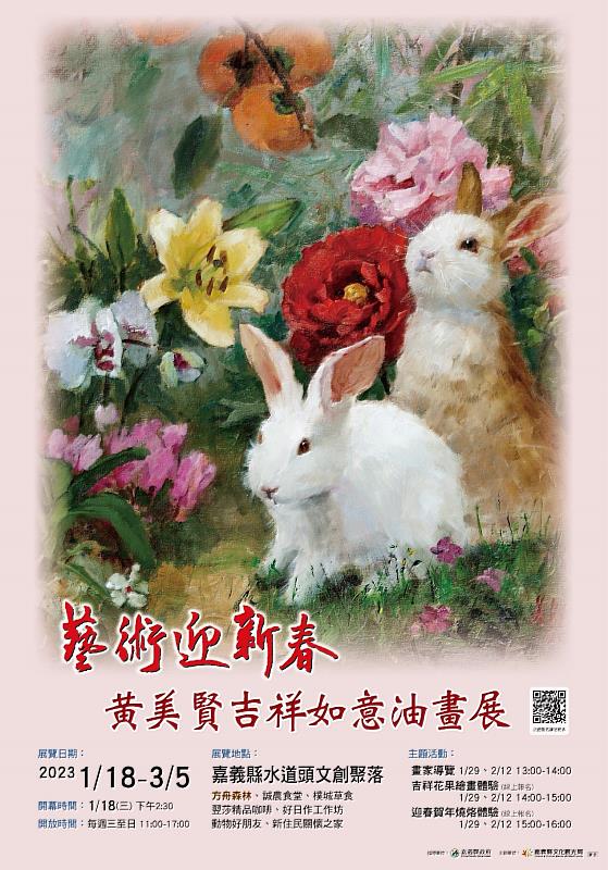 (中央社訊息服務20230118 15:26:39)嘉義縣文化觀光局為與民眾喜迎兔年,邀請素有「台灣田園花果畫家」的黃美賢博士,於1月18日至3月5日在嘉義水道頭文創聚落園區舉辦「藝術迎新春─黃美賢吉祥如意油畫展」,並於展期間辦理新年主題藝文活動,歡迎愛好藝術的民眾踴躍前往觀賞。