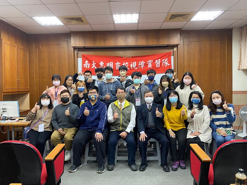 (中央社訊息服務20230119 16:18:37)國立臺南大學特殊教育學系於1月16至19日,由該系林慶仁教授帶領16位大四的師資生,前往台中私立惠明盲校進行四天實地學習,期盼師資生把大學課堂所學的理論知識,實際應用協助有多重需求的孩子,也能從惠明盲校的老師身上學到教學實務技巧。