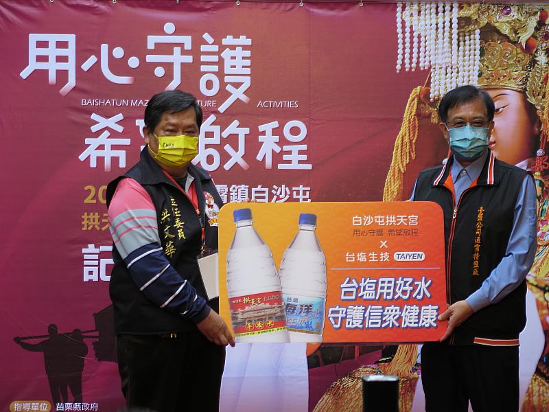 10日拱天宮「用心守護,希望啟程」記者會,由通霄精鹽廠劉鴻泉廠長代表臺鹽公司贊助一千箱「台塩海洋生成水」,並偕同苗栗縣長鍾東錦、拱天宮主委洪文華等幹部,共同為繞境典禮祈福。
