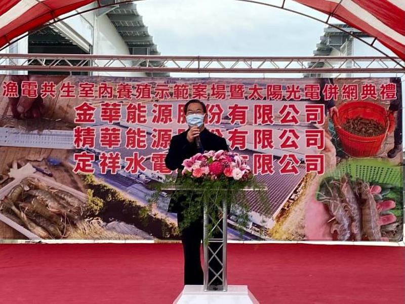 落實台南能源轉型政策,響應南市府秉持「漁業為主、綠電加值」原則,葉副市長受邀蒞臨參與,他感謝金華及億祥能源落實農地農用為原則,將國家的能源政策、照顧生態及漁民的生活等多方需求整合一起,期許這個案場未來能樹立一個很好的示範場域,讓養殖業結合綠能業者齊頭並進,不但能為漁民帶來穩定收入,帶動地方繁榮及就業。
