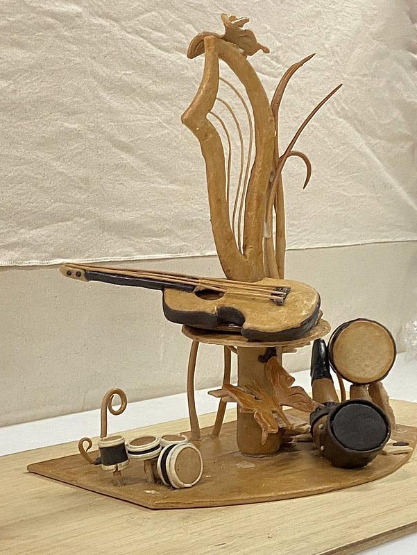 大葉大學的金牌選手紀東豫畢業於旭光高中,大學才開始接觸烘焙,去年曾在荷蘭國際餐飲挑戰賽獲頒銀牌,這是他第二次參加國際比賽,一舉拿下金牌。烘焙學程二年級的紀東豫表示,一年級下學期的時候,他第一次接觸到藝術麵包,就對藝術麵包很感興趣,蔡振彰老師鼓勵他往藝術麵包創作去發展,也指導他挑戰比賽,比賽作品「樂世界」以音樂為主題,他在網路上看到豎琴的照片,覺得形狀與線條很漂亮,因此想用藝術麵包來呈現不同的樂器,作品裡面有豎琴、吉他、傳統鼓、爵士鼓、號角,還有象徵生命力的植物與蝴蝶,透過這些元素表達開心的感覺,音樂跟烘焙或許是不同領域,但藉由藝術麵包來表現,同樣能夠展現愉快的氛圍,謝謝比利時觀光美食節國際大賽評審喜歡這件作品。