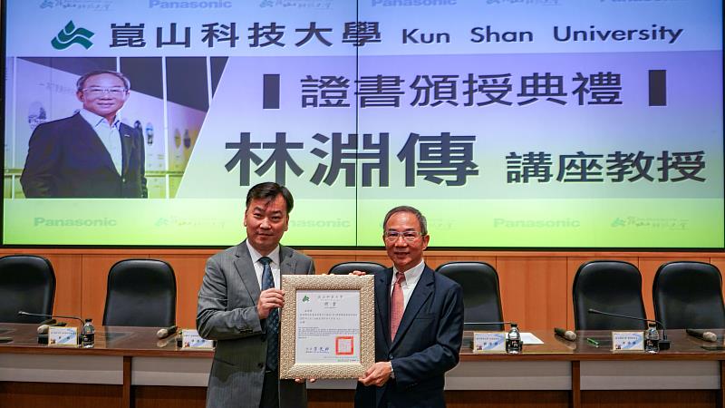 崑山科大與台灣Panasonic集團密切交流,共同擘劃智慧節能應用及智慧節能社區開發,該校更於去年承辦「2022智慧能源高峰會」、「2022第七屆綠色生活創意設計大賽」等活動,獲得林淵傳總經理的高度肯定。該次邀請到林淵傳總經理以〈開啟事業寬廣道路〉為題,分享數十年在國際企業服務的心路歷程,同時為表彰林淵傳總經理對於環境保護與智慧能源產業的貢獻,在全校教師的見證下,由李天祥校長親自頒授榮譽講座教授證書。