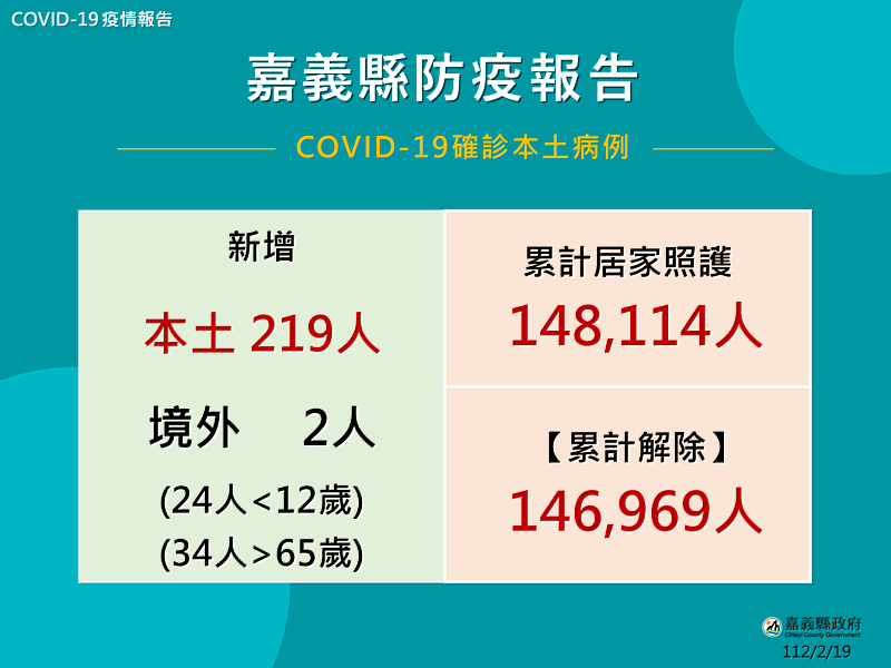 (中央社訊息服務20230220 09:24:11)嘉義縣新冠肺炎今天(19日)新增221人確診(境外2人),累計全縣12歲以下染疫幼童19,252人,65歲以上22,478人,輕症居家照護1,145人。