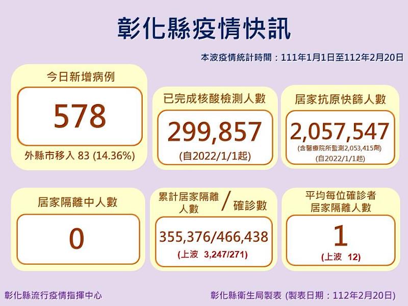 (中央社訊息服務20230220 15:19:10)彰化縣2月20日防疫說明,縣長王惠美表示,彰化縣今天新增578例。自2022年起已完成核酸檢測人數29萬9,857人,居家抗原快篩人數205萬7,547人,居家隔離中人數0人,累計居家隔離人數35萬5,376人,確診數46萬6,438人,平均每位確診者居家隔離人數1人,提醒大家,仍要落實防疫,勤洗手、戴口罩,保持社交距離,一起守護健康家園。
