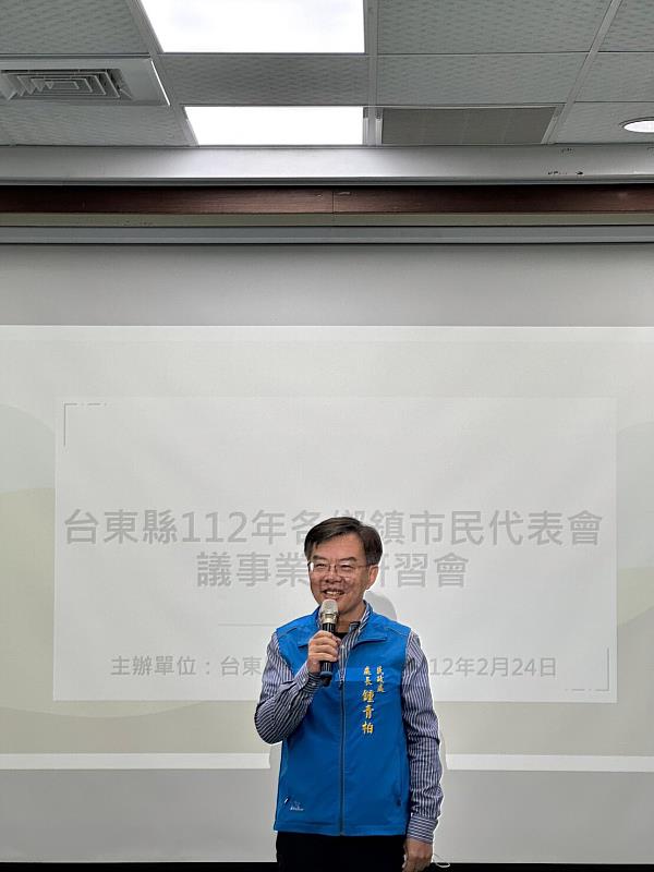 (中央社訊息服務20230224 16:11:22)臺東縣政府為強化各鄉鎮市民代表會之組織功能、充實鄉鎮市民代表會議事人員相關知能,特於今(24)日舉辦「臺東縣112年度鄉(鎮、市)民代表會議事業務研習會」,由民政處長鍾青柏主持,並邀請內政部民政司黃瀚儀視察講授「地方民意代表費用支給法制及實務案例」,全縣各鄉鎮市民代表會秘書與議事人員參加。