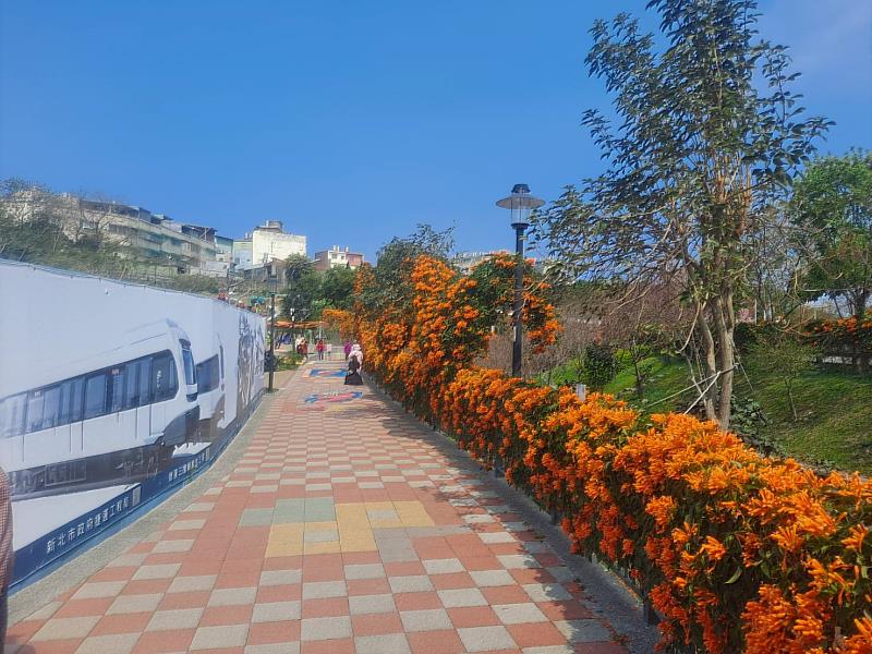 位於新北市鶯歌區的永吉公園,以豐富多樣的植栽及特色造型遊具成為廣受大小朋友歡迎的熱門景點。目前正值園內炮仗花、櫻花花期,特別鮮豔好拍,形成紅橘、粉白雙色花海,構成鮮豔的花景,雙色呼應更顯夢幻壯觀;泰山區的黎明步道花園,炮仗花花牆延綿約300公尺,園內浪漫粉紅吉野櫻、夢幻梅花同步盛開,超級浪漫;而位在捷運海山站3號出口,土城區希望之河廣場,水畔兩岸的炮仗花及吉野櫻配上充滿延伸感的欄杆,能拍出不一樣的花海,成為網紅打卡熱點;蘆洲區鴨母港溝兩側河岸及新莊區中港大排自立廣場兩側周邊堤牆綿延百尺以上的炮仗花牆,伴隨微風吹拂,搖曳的身影好似喜氣洋洋的鞭炮雨,別有一番風情,也是附近居民運動、散步的賞花秘境。