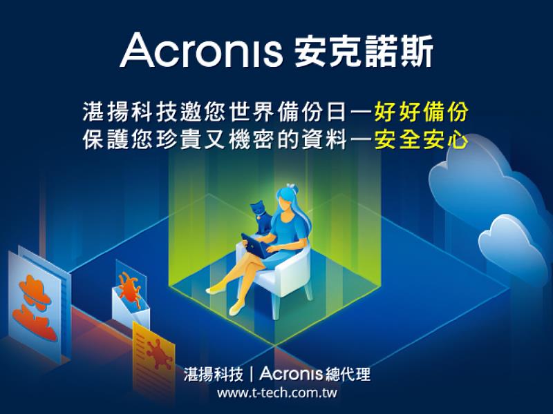 為讓您輕鬆落實在331世界備份日做好資料備份,Acronis安克諾斯台灣總代理 湛揚科技首次推出「三年版Acronis Cyber Protect Home Office」訂閱軟體。即日起,除企業產品用戶,個人版用戶也可以購買三年版的備份軟體。湛揚科技在官方授權商城—《享購物ENJOYSHOP》http://www.enjoyshop.com.tw/全台獨家首賣。即日起至3月31日止,再加碼全館防毒及備份軟體8折起,購買數位版商品滿千折百,讓您以最優惠的價格輕鬆在331世界備份日做好備份資料作業!更多Acronis安克諾斯產品優惠及資訊,請洽詢總代理湛揚科技02-2515-1585或瀏覽湛揚科技官網https://www.t-tech.com.tw/。