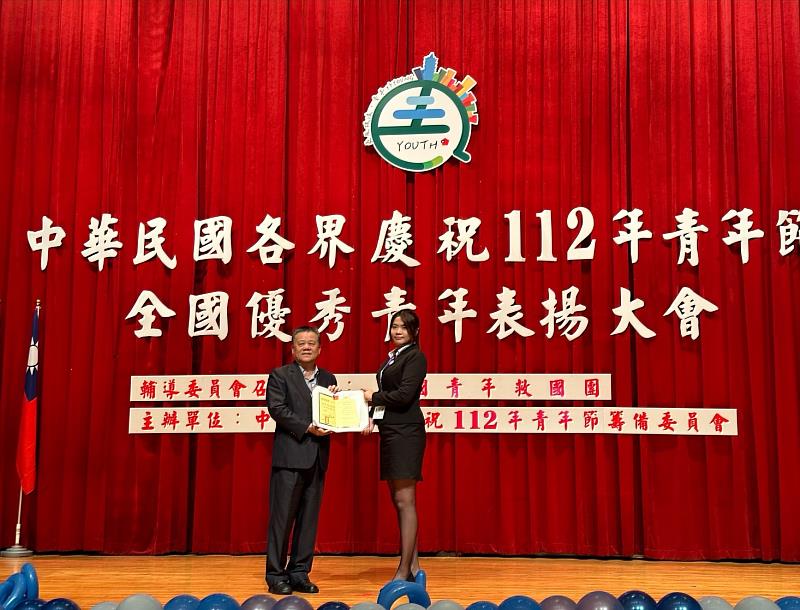 (中央社訊息服務20230330 15:10:00)慶祝112年青年節,全國優秀青年表揚大會活動29日於台北劍潭青年活動中心舉辦。其中,開南大學資訊傳播學系金詩晴脫穎而出,獲得全國大專優秀青年殊榮。另外,空運學系林文淇則獲得桃園市大專優秀青年,兩位榮譽優秀的表現,獲得師生們喝采。