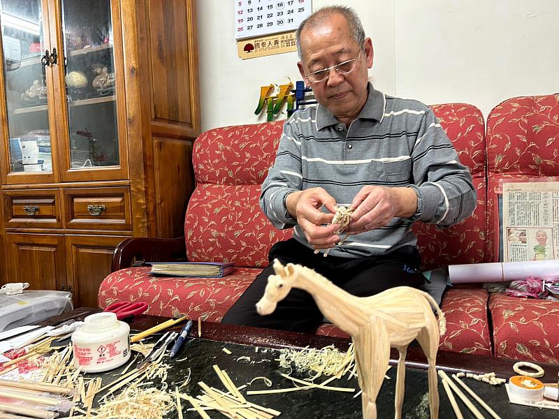 湯爺爺退休後在城隍廟幫忙,他揉合對民間信仰的敬意將美感、歷史融於作品中,本次展出有「神轎」和「祥龍獻瑞」作品,將竹筷切薄片塑型,變成佈滿龍身的細鱗,讓人感受寧靜和平安的祝福。還有看了讓人會心一笑的「神豬」,是看到三峽神豬比賽的創意,為道地台灣文化的展現;而「杯狗旺旺」則是湯爺爺將竹筷削成比牙籤還要細的短竹籤,一根根黏在頭上變成狗狗濃密的毛髮,連黑黑圓圓的眼鏡和鼻子也是竹筷裁剪、砂紙磨平製作,非常細膩。
