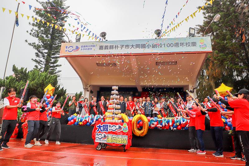 (中央社訊息服務20230401 17:38:29) 嘉義縣朴子市大同國小今日歡慶創校100週年校慶,以「大同100.邁向國際」為主題規劃百年校慶,在校園內舉行國際童玩園遊會及熱鬧市集,翁章梁縣長到場祝賀,為傑出校友們頒獎,歡唱生日快樂歌,會後前往校史室進行揭牌儀式,見證大同國小創校百年的豐富歷史。
