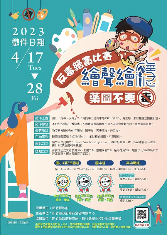 (中央社訊息服務20230410 09:26:29)小小畫家照過來!為反毒議題向下扎根,新竹縣政府毒品危害防制中心特別舉辦「繪聲繪『癮』,藥圖不要『毒』-反毒繪畫比賽」,分為國小組、國中組及高中職組,以「拒毒、反毒」、「毒防中心諮詢專線」為主軸,並以標語結合圖畫設計,設置最高獎金2000元,從4月17日開放報名至4月28日截止,歡迎小畫家們大展身手,期盼強化宣導反毒向下扎根。