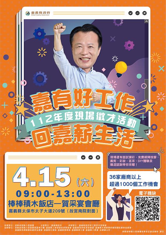 另外,還有規劃無人機、輔具展示及免費彩妝、義剪、視障按摩體驗、茗茶,嚐點心、射箭體驗、DIY,還有多項免費體適能檢測,活動資訊詳情請上嘉義縣政府勞工暨青年發展處網站,職缺查詢掃描海報QRcode ( https://reurl.cc/o0Vq9v )快速又便利,或電洽05-3621195將有專人為您服務。