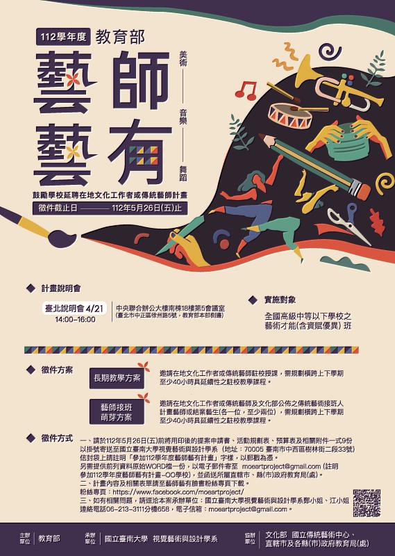 (中央社訊息服務20230413 10:36:48)「112學年度藝師藝有計畫」來啦!即日起展開全新112學年度鼓勵學校延聘在地文化工作者或傳統藝師計畫(以下簡稱本計畫),本計畫由國立臺南大學視覺藝術與設計學系承接辦理, 除延續過去8年執行在地藝術、文化技藝傳承落實於藝術才能(含資賦優異)班教學內容,值得一提的是,本計畫今年首次與文化部合作,將結合文化部國立傳統藝術中心的資源,積極與傳統藝術接班人計畫合作並推廣新的課程執行方案,推動駐校教學的藝術師資更專藝發展,提升藝術教育品質與水準,希望在傳統藝術傳承教育中,注入新的活力和創意,更讓在地藝術文化技藝能夠落實到教學內容中。