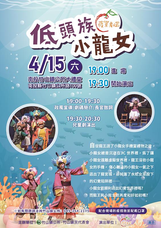 (中央社訊息服務20230413 12:37:43)家裡也有小小低頭族嗎?南投縣竹山鎮公所致力於在地藝文推廣,以及藝文教育培養,特與南投縣蔡培慧立法委員攜手,於四月兒童月規劃兒童劇場,邀請到國內知名劇團-蘋果劇團於4月15日(六) 晚上19:30在竹山鎮公所大禮堂,帶來精彩好戲《低頭族小龍女》回饋竹山親子,寓教於樂的戲劇演出,帶出時下低頭族年齡層降低議題,與家長一同抵抗手機殭屍的誘惑。