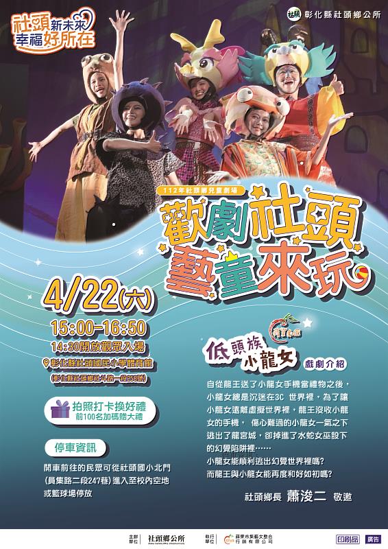 (中央社訊息服務20230414 09:59:51)彰化縣社頭鄉公所為在地親子推廣藝文活動不遺餘力,因應四月「兒童月」,公所攜手蘋果劇團舉辦「112年社頭鄉兒童劇場-歡劇社頭,藝童來玩」活動,將於4月22日(六) 下午15:00在社頭國小體育館盛大登場,社頭鄉蕭浚二鄉長誠摯邀請在地親子家庭與各地親朋好友共同歡劇社頭,一起與孩子們同樂。