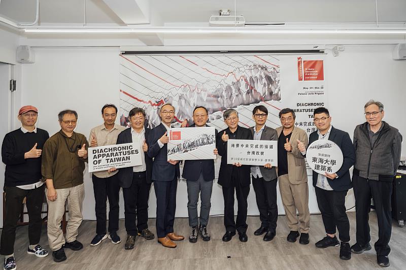 (中央社訊息服務20230425 17:33:21)文化部所屬國立臺灣美術館主辦,東海大學建築系團隊策畫的「第18屆威尼斯建築雙年展-臺灣館」參展計畫〈地景中未完成的協議-台灣改裝〉,將於5月20日至11月26日在義大利威尼斯普里奇歐尼宮(Palazzo delle Prigioni)展出。今(25)日行前記者會,文化部長史哲、國立臺灣美術館長廖仁義、外交部歐洲司長姚金祥、內政部營建署副署長徐燕興、評審委員黃健敏、徐明松;建築學家曾成德、東海大學創意設計暨藝術學院長許和捷、策展人曾瑋、協同策展人郭聖傑、何炯德、蘇孟宗等出席。