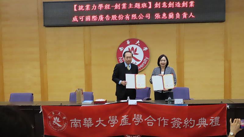 南華大學主任秘書胡聲平開場致詞時表示,董事長除了經營威可,同時兼任威鼎整合行銷和威台紙業兩家公司的董事長,是創業有成的女強人,令人十分敬佩。威可公司的slogan「思維國際化視野全球化,威可廣告與時並進」,在終身學習與跨領域的時代如何與時俱進,在張董事長的分享中必能有所收穫。