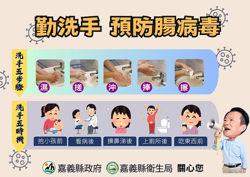 (中央社訊息服務20230427 14:55:00)隨著疫情解封口罩鬆綁,又逢腸病毒流行期,為防堵腸病毒疫情,嘉義縣全面啟動腸病毒防治作為,包括縣府跨局處校園聯合稽查及長庚、慈濟腸病毒重症責任醫院整備、產後護理之家及托嬰中心查核,強化校園洗手五步驟及五時機宣導,翁章梁縣長責成縣府團隊積極防範,守護幼童健康。