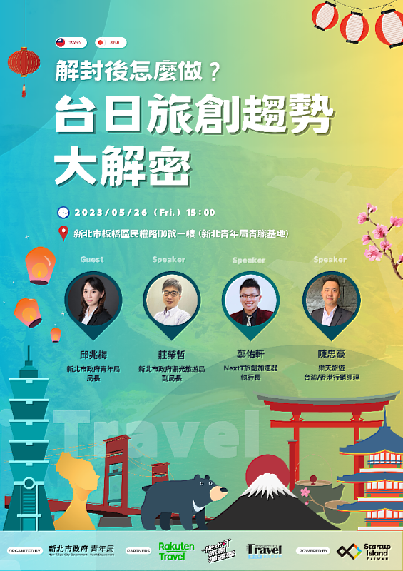 (中央社訊息服務20230510 09:50:58)【新北市訊】新北市政府青年局將於5月26日(五)下午3點在「新北青年局青職基地」(板橋區民權路170號)舉辦臺日旅遊創業交流講座,演講主題:「解封後怎麼做?臺日旅創趨勢大解密」,由青年局與國家新創品牌Startup Island TAIWAN合作邀請樂天旅遊Rakuten Travel臺灣/香港行銷經理陳忠豪、NextT旅創加速器執行長鄭佑軒及新北市政府觀光旅遊局副局長莊榮哲擔任講者,分享臺灣和日本在旅遊產業中不同的創新實踐和趨勢。