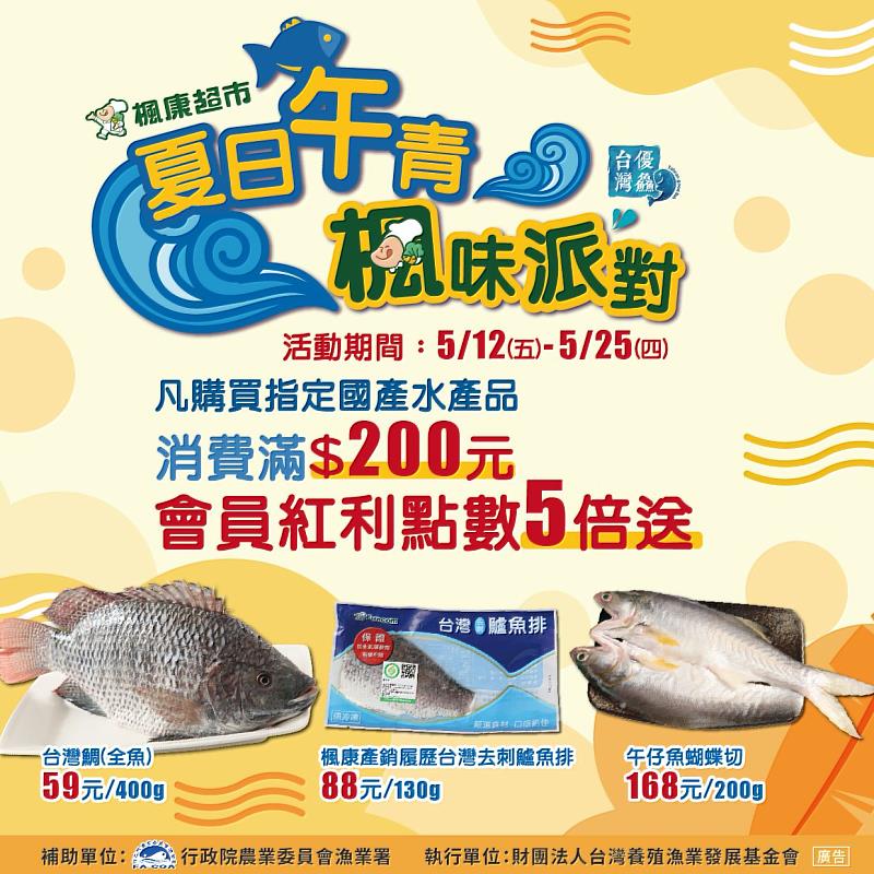 (中央社訊息服務20230512 09:29:25)溫馨感恩的五月初夏,為推廣「依旬而食」享用在地優質水產品,漁業署輔導財團法人台灣養殖漁業發展基金會與楓康超市合作推出「夏日午青,楓味派對」,即日起至5月25日止,只要選購指定國產水產品滿200元,即可享會員紅利點數5倍加碼送,推薦民眾一同品嚐當令新鮮肥美的午仔魚、臺灣鯛、金目鱸、石斑、牡蠣等優質價美國產水產品,為自己和家人健康鱻打底!
