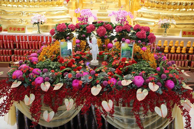 常春藤代表著「長壽」與「生命力」、牡丹菊與乒乓菊則是「吉利」的代表,點綴其中的康乃馨,代表著佛陀母親的慈愛。各種花草組合,也與靈鷲山「生命和平」、「靈性生態」理念相應,細緻的工藝不但讓人欣賞設計的美感功底,也從種種象徵的嵌入,看出花藝老師們深厚的佛學素養。
