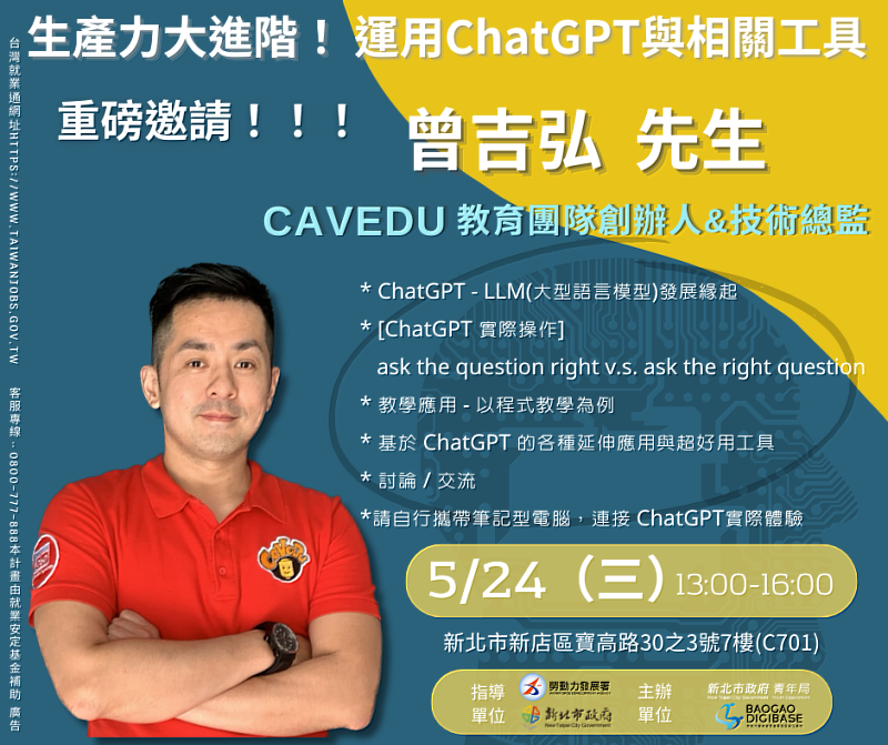 (中央社訊息服務20230515 16:52:51) 數位革命來襲!ChatGPT引發不可擋的全球性AI潮流,新北市政府青年局首推ChatGPT免費課程,於5月24日(三)下午1點在寶高數位基地(新北市新店區寶高路30之3號7樓)舉辦「生產力大進階!運用ChatGPT與相關工具」,邀請到CAVEDU 教育團隊創辦人&技術總監-曾吉弘博士,帶領大家更深入了解ChatGPT。