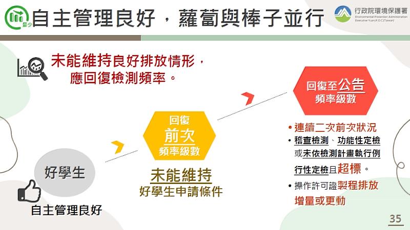 (中央社訊息服務20230518 15:42:57)行政院環境保護署於111年6月6日修正「固定污染源自行或委託檢測及申報管理辦法」明訂「好學生條款」,鼓勵公私場所業者做好自我管理,減少非必要檢測數量,同時新增「功能性定期檢測」給予環保機關提升管理強度,業者應提「空污排放檢測計畫」提升定期檢測數據品質,以落實「量少、質精及有效管理」精神。