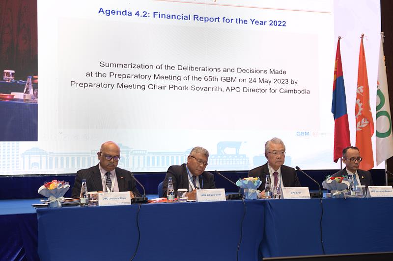 亞洲生產力組織(APO)第65屆理事會議(Governing Body Meeting, GBM)」於2023年5月24-26日在會員國蒙古烏蘭巴托舉行。APO成立於1961年,我國係以中華民國(ROC)名義參加之國際組織,為8個創始會員國之一,該組織共有21個會員國,部分會員國為東協成員之一。此次會議為COVID-19疫情後首次以實體方式召開的理事會議,計有APO 19個會員國之理事及代表44人及2名觀察員與會(本屆伊朗未派員出席)。我國由財團法人中國生產力中心許勝雄董事長以我國理事身分率團,團員包含外交部亞西及非洲司吳正偉副司長、駐烏蘭巴托台北貿易經濟代表處陳欽彥一等秘書、該中心張寶誠總經理、聯絡官薛夙晴經理及朱芳婷副理共6人出席會議。