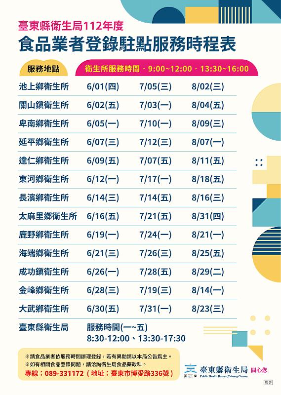 (中央社訊息服務20230525 13:44:54)臺東縣食品業者登錄及食品標示廣告輔導服務列車出發囉!6月起巡迴縣內各鄉鎮