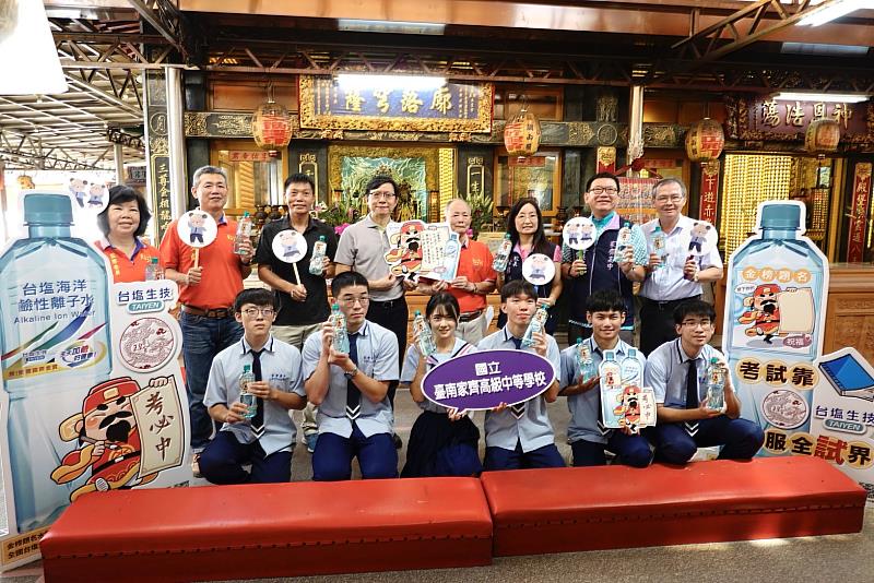 (中央社訊息服務20230607 15:14:19)配合考季,臺鹽公司推出限量「金榜題名」版台塩海洋鹼性離子水,本次特別與台南市歷史悠久的開基玉皇宮合作,只要憑准考證即可向廟方兌換由臺鹽公司贊助的「金榜題名」版台塩海洋鹼性離子水,7日台南市家齊高中由陳韻如校長率領考生參拜玉皇大帝與五文昌公,而後臺鹽公司陳世輝總經理、開基玉皇宮副主委王飳乾、家齊高中陳韻如校長等師生,一同在「金榜題名水」寫下考試祈願祝福,盼考生們應試「鹼」單過關,表現超「水」準。