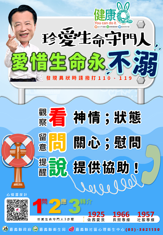 趙紋華局長表示,衛生局結合網絡單位在高風險區域設置「珍愛生命永不溺」告示牌,提醒民眾行經橋墩或水域時,若發現神情異常民眾,發揮守門人的精神,運用人一問、二應、三轉介來協助,也可即時撥打電話110、119請求協助,目前全縣3大主要溪流朴子溪、牛稠溪及八掌溪22座橋墩皆已完成設置,另已協調交通部觀光局雲嘉南濱海國家風景區管理處及縣府農業處,將布袋海風長堤、第三漁港及東石漁港同步設置,提醒民眾珍愛生命。