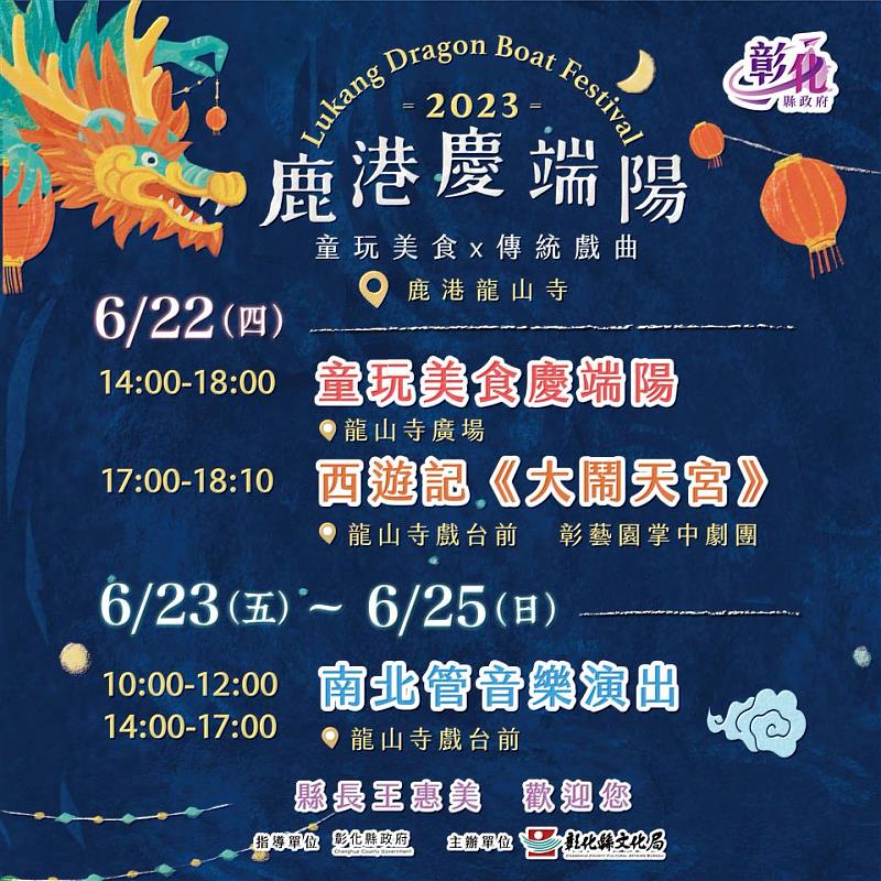 (中央社訊息服務20230621 16:22:15)全國首屈一指的端午節慶「2023鹿港慶端陽」將在6/22(四)至6/25(日)展開系列活動,其中在鹿港龍山寺廣場特別舉辦「童玩美食慶端陽」及精彩的傳統戲曲演出,縣長王惠美歡迎全國各地的朋友共襄盛舉!