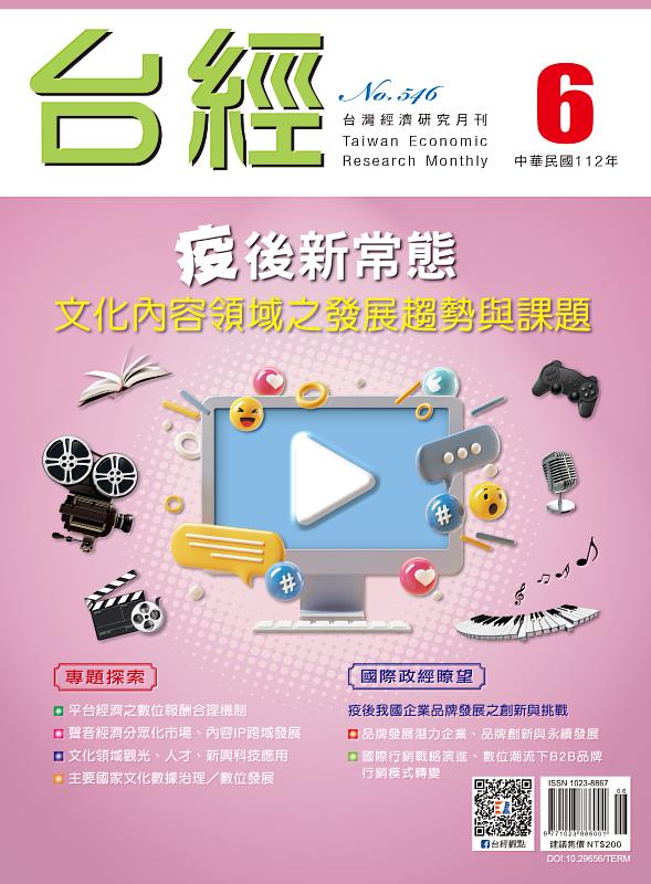 由台灣經濟研究院出版的《台經月刊》在6月號專題鎖定文化內容領域,透過國際相關文獻以及標竿案例分析,觀察疫後文化內容領域新興發展趨勢,如Podcast、有聲書等聲音經濟的進化、文化內容IP (Intellectual Property)的跨域發展模式、文化相關領域之新興科技應用,如延展實境技術(Extended Reality, XR)與生成式人工智慧(AI Generated Content, AIGC)等,以及觀光領域新發展模式等。