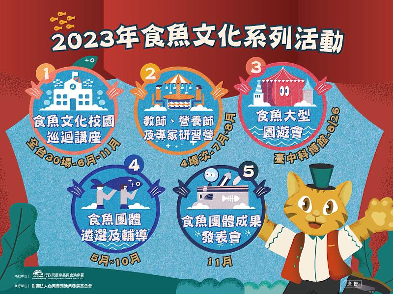 漁業署長期推動食魚教育及文化推廣,今日活動宣告2023年食魚文化系列活動正式起跑!自今年6月起陸續於全臺30所國民小學舉辦「2023鱻旅奇緣–大魚樂家」食魚文化校園講座;7至8月暑假期間舉辦4場次研習營,邀請學校教師、營養師等一同參與食魚教育進而推廣增能;8月26日將於臺中市國立自然科學博物館辦理戶外親子食魚園遊會。今年亦將開發挑魚刺教材包及辦理食魚團體輔導等,從校園開始逐步推廣至家庭,進而到社會大眾,讓全民一起快樂學習食魚知識、享食魚。