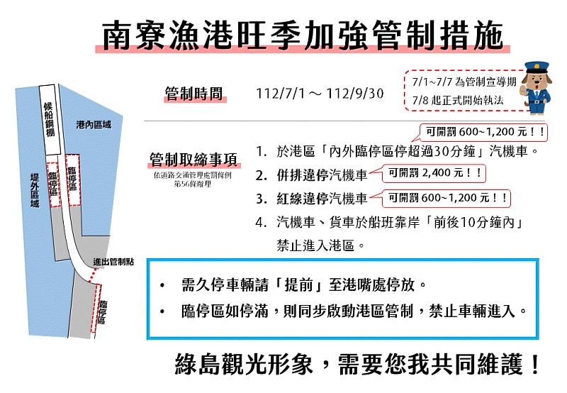 臺東縣政府交通及觀光發展處代理處長江慧卿表示,為使民眾了解今年度管制措施,7/1起至7/7止為管制宣導期,將對違反管制措施之民眾進行積極勸導,並自7/8正式執法,項目包括「內外臨停區停超過30分鐘」汽機車、併排違停汽機車、紅線違停汽機車,將依道路交通管理處罰條例第56條規定,最高可罰2400元,另於船班靠岸前、後10分鐘內禁止汽機車進入港區,屆時請民眾留意交通及管制規定,切勿以身試法,共同維護綠島南寮漁港觀光形象,改善旺季港口的交通秩序。