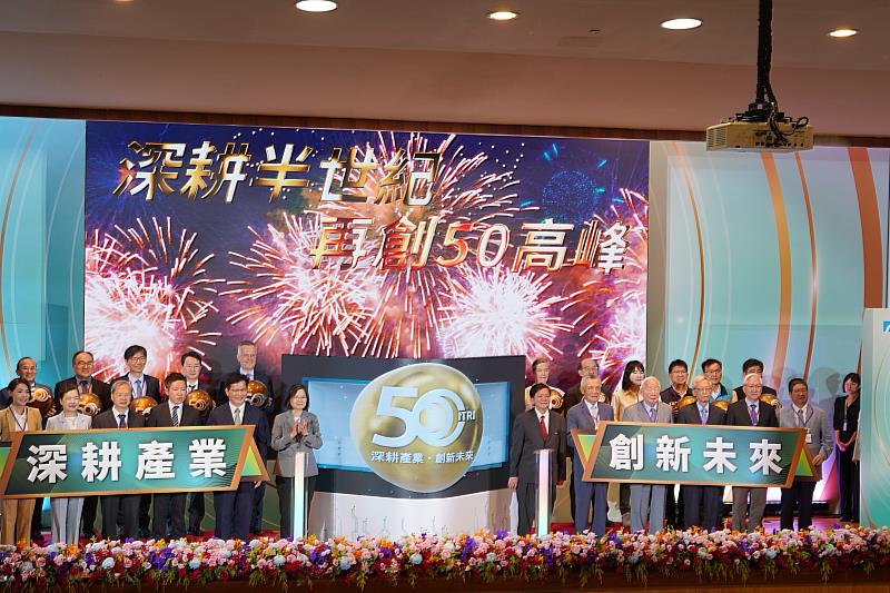總統蔡英文和總統府秘書長林佳龍、經濟部長王美花首先參觀工研院史料館。蔡英文致詞表示,工研院帶領台灣從勞力密集的產業結構,變為科技導向的高科技大國,奠定台灣半導體產業發展基石。另外,台灣的資通電、資通訊、光電、碳纖維腳踏車,取得世界領先的地位,最初也來自工研院的投入。她說,50年前工研院在動盪的國際局勢中誕生,50年後已是世界級的科技研發機構,幫助台灣成為全球供鏈不可或缺的關鍵力量。因應生成式AI對產業的影響,工研院今年組跨領域的策略小組,探討AI的應用及法規,因應時代的挑戰,蔡英文期許工研院繼續走在台灣尖端,幫助台灣強化國際競爭力,讓台灣之光繼續閃耀世界。