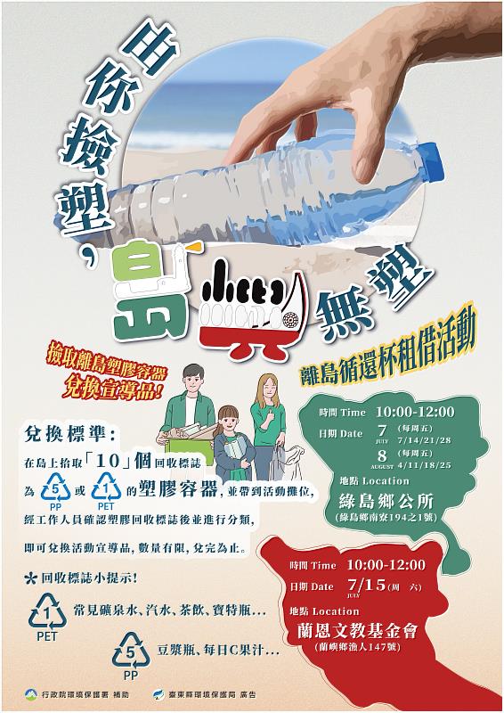 為減少島上塑膠污染,臺東縣環境保護局辦理「由你撿塑,島嶼無塑」活動,7至8月每週五上午10時至12時在綠島鄉公所、7月15日上午10時至12時在蘭嶼「蘭恩文教基金會」音樂節辦理,共計有9場次,民眾只要在島上撿取1號(PET)或5號(PP) 廢塑膠容器達10個,並將廢塑膠容器帶到活動現場,經工作人員確認後即可兌換宣導品,一人限領一份,數量有限,歡迎民眾及遊客共襄盛舉,一同維護良好的島嶼生態環境。