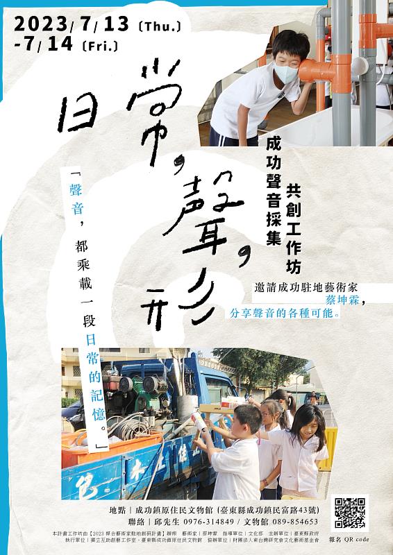 此次《日常,聲,形》-成功聲音採集共創工作坊,由駐地藝術家豐富的聲音採集經驗,帶領參與成員製作聲音採集器,並實際於成功鎮內進行聲音採集,最後進行聲音雕塑製作,臺東縣政府文化處、成功鎮原住民文物館與駐地藝術家蔡坤霖邀請民眾共同前來透過不同的方式認識聲音的樣貌。