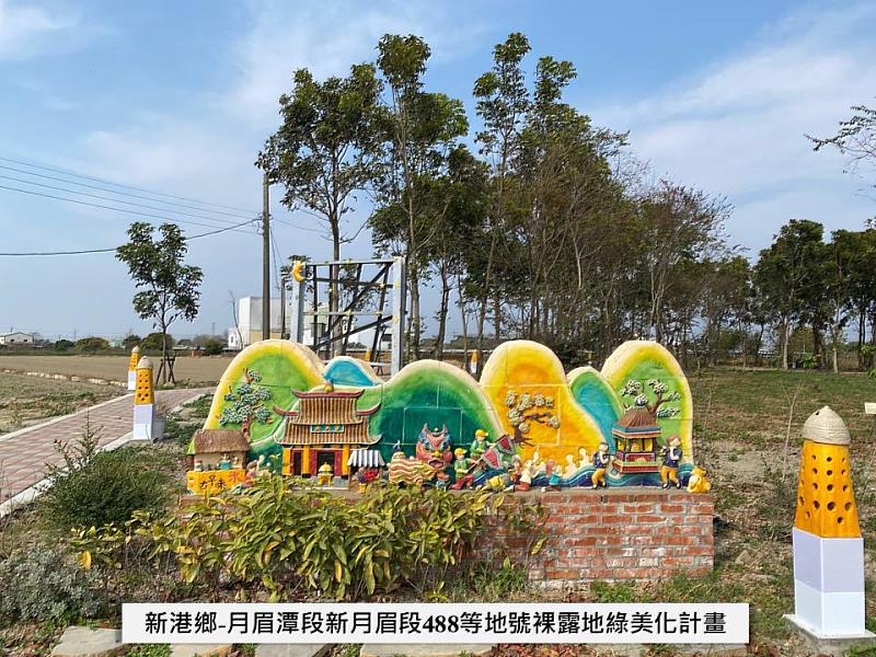 新港鄉月眉社區發展協會認養「月眉潭段新月眉段488等地號裸露地綠美化計畫」空品淨化區,社區志工利用閒暇時間整理環境、種植花草,在淨化區角落妝點交趾陶工藝,致力綠美化打造清淨綠生活,成為附近居民休閒好去處。