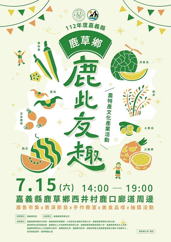(中央社訊息服務20230714 09:30:55)夏天來去嘉義縣鹿草鄉,112年度鹿草農特產文化產業活動「鹿此友趣」,週六15日下午2點在鹿草西井村鹿口廊道周邊,由鹿草鄉公所、鹿草鄉農會及大成長城企業攜手農民及青創店家舉辦,邀請鄉親來逛市集、看表演、吃美食。