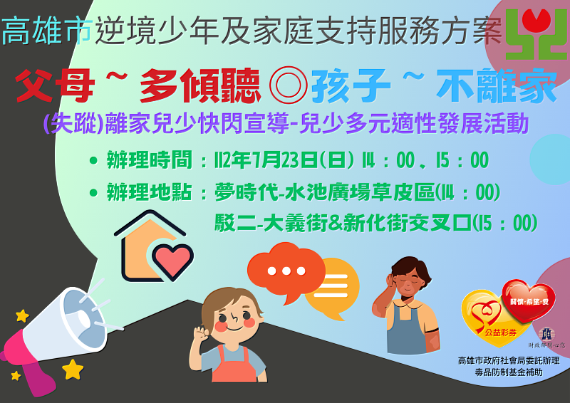 (中央社訊息服務20230717 16:35:00)高雄「張老師」中心於今年112年承接「高雄市社會局逆境少年及家庭支持服務方案」,服務對象有施用毒品兒少、偏差行為兒少、失蹤兒少(自願離家,不含遭親屬擅帶離家兒少)、司法矯治少年,針對以上四類型服務對象以家庭為中心,提供兒少及其家庭相關福利服務,支持性輔導及其他相關資源連結、轉介等服務。有鑑於112年上半年在服務類型中的失蹤兒少類型,年齡層在13歲至17歲之青少年,開案服務量居高不下。從社工服務的過程探討,在青少年階段正處於混淆及矛盾的狀態中,父母未能了解青少年此時此刻的身心俱變,在青少年所謂的叛逆期,未多加傾聽青少年內心的聲音,以鼓勵代替責備,反將以否定青少年之惡言,將青少年推出門外,當青少年有了外在的誘惑及拉力,讓青少年選擇離家出走;當青少年離家在外無所資源提供下,進而有觸及犯罪議題的發生。