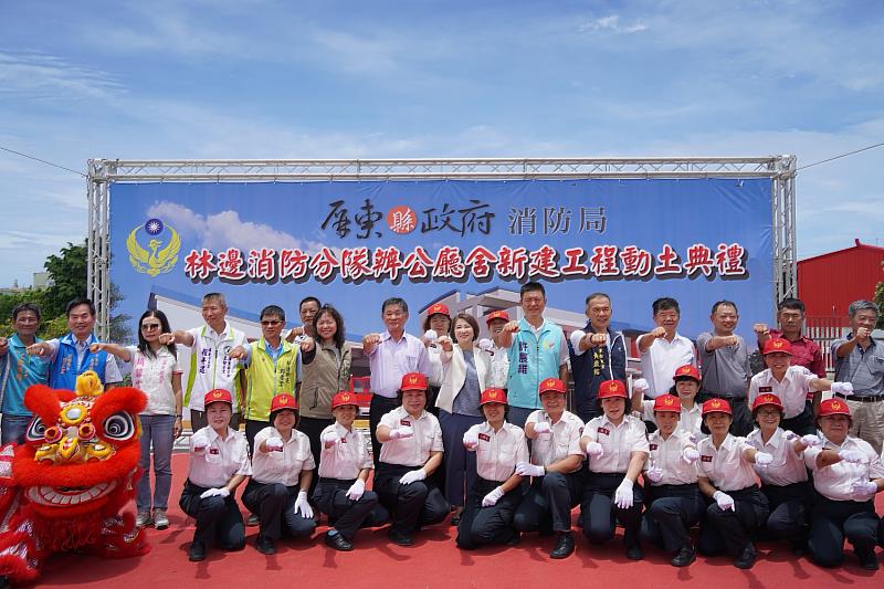 (中央社訊息服務20230718 15:16:58)屏東縣政府消防局18日上午在林邊鄉舉辦消防分隊廳舍新建工程動土典禮,廳舍規模為一棟地上二層之新建物,基地面積約2228.76平方公尺,建築經費約4900萬元,預計於明(113)年11月完工,提供林邊消防分隊更優質的緊急應變、指揮救災救護、辦公空間等。活動由精彩的舞獅為典禮揭開序幕,並由縣長周春米親自主持,消防署副署長簡萬瑤、地方各級民意代表及地方人士等貴賓共襄盛舉,場面隆重。