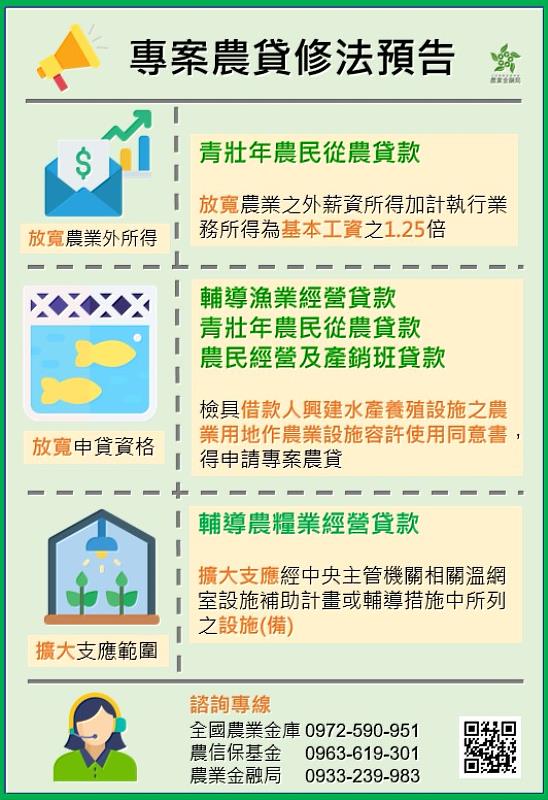 農金局表示,為配合青壯年從農、水產養殖業生產轉型、智能防災設施型農業等政策之推動,經與相關產業機關召開會議研商獲致共識,擬具「辦理政策性農業專案貸款辦法」修正草案,依行政程序法規定,自112年7月26日起踐行預告程序,以徵詢各方意見,修正重點如下: