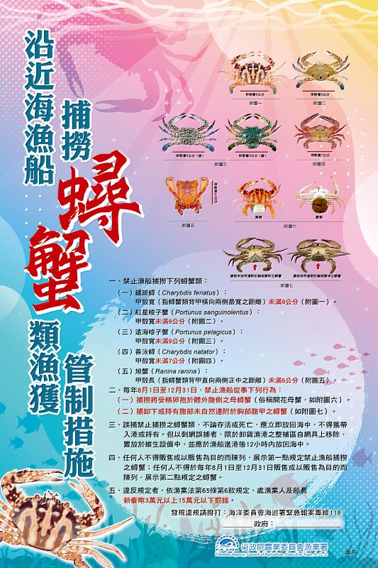 漁業署說明,「沿近海漁船捕撈蟳蟹類漁獲管制措施」規定鏽斑蟳、紅星梭子蟹、遠海梭子蟹甲殼寬未滿9公分、善泳蟳未滿7公分,以及旭蟹甲殼長未滿6公分禁止捕撈,規定蟳蟹甲殼寬捕撈,是讓蟳蟹資源能達到性成熟體長,有機會交配繁衍下一代,而8月至12月禁捕抱卵母蟹是讓抱卵母蟹能夠在海洋環境中自然繁衍生息。此外,今年增列禁止漁船卸下、持有及任何人不得販售腹甲離身之蟳蟹類,杜絕有心人士規避每年8月1日禁捕及禁售抱卵母蟹規定,違反捕撈及販售規定者最高可罰15萬元。