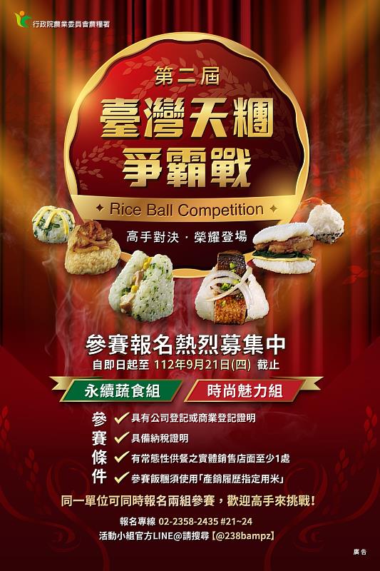 農糧署表示,為推進綠色飲食新潮流,今年舉辦「第二屆臺灣天糰爭霸戰」,以「永續蔬食」及「時尚魅力」為主題,凡具合法稅籍登記及公司(或商業、工廠)登記且具實體銷售店面業者皆可報名,並以產銷履歷稉型白米製成含米量60%以上之飯糰參賽。其中,「永續蔬食組」僅能使用不含動物肉及肉製加工衍生品之食材及調味料,研發風味口感兼具的蔬食飯糰,期可透過後續量產合作,逐步開拓冷凍調理飯糰外銷市場,將臺灣飯糰推向國際舞台;「時尚魅力組」則是著重結合國產地方農特產品,製作具冷藏鮮食量產潛力、符合市場接受度的魅力飯糰參賽,提供消費者全新飯糰享受。