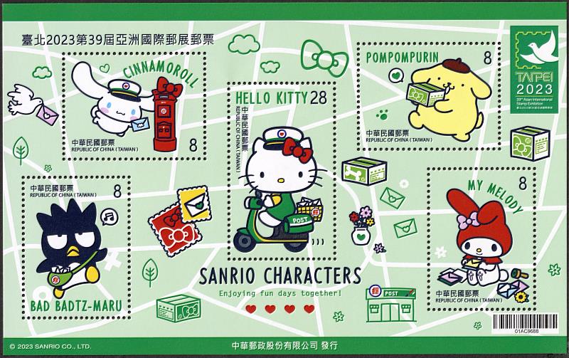 (中央社訊息服務20230731 11:59:17)配合臺北2023第39屆亞洲國際郵展第3日「舞動青春日」主題,中華郵政公司特以深獲民眾喜愛的三麗鷗家族SANRIO CHARACTERS-HELLO KITTY、大耳狗喜拿、酷企鵝、布丁狗及美樂蒂等主角,並以「傳遞幸福」與「寶島觀光」為主題,訂於112年8月11日發行「臺北2023第39屆亞洲國際郵展郵票小全張—SANRIO CHARACTERS」小全張2張,每張均含5枚郵票,內含郵票面值分別為8元4枚、28元1枚及6元、9元、13元、15元、17元各1枚。