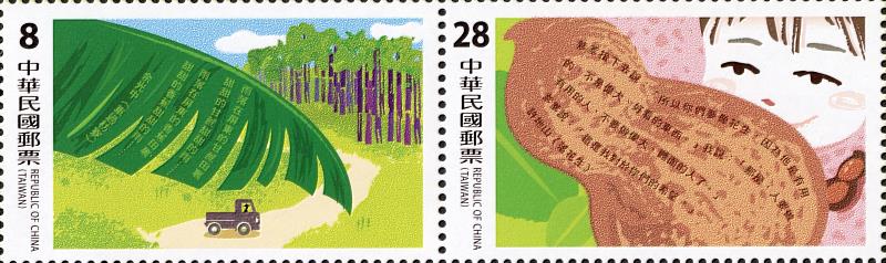 一、面值8元郵票:摘錄余光中〈車過枋寮〉—雨落在屏東的甘蔗田裏 甜甜的甘蔗甜甜的雨……雨落在屏東的香蕉田裏 甜甜的香蕉甜甜的雨……。甘蔗、香蕉都是臺灣重要的傳統經濟作物,藉以勾勒出樸實的鄉土情懷及臺灣味。